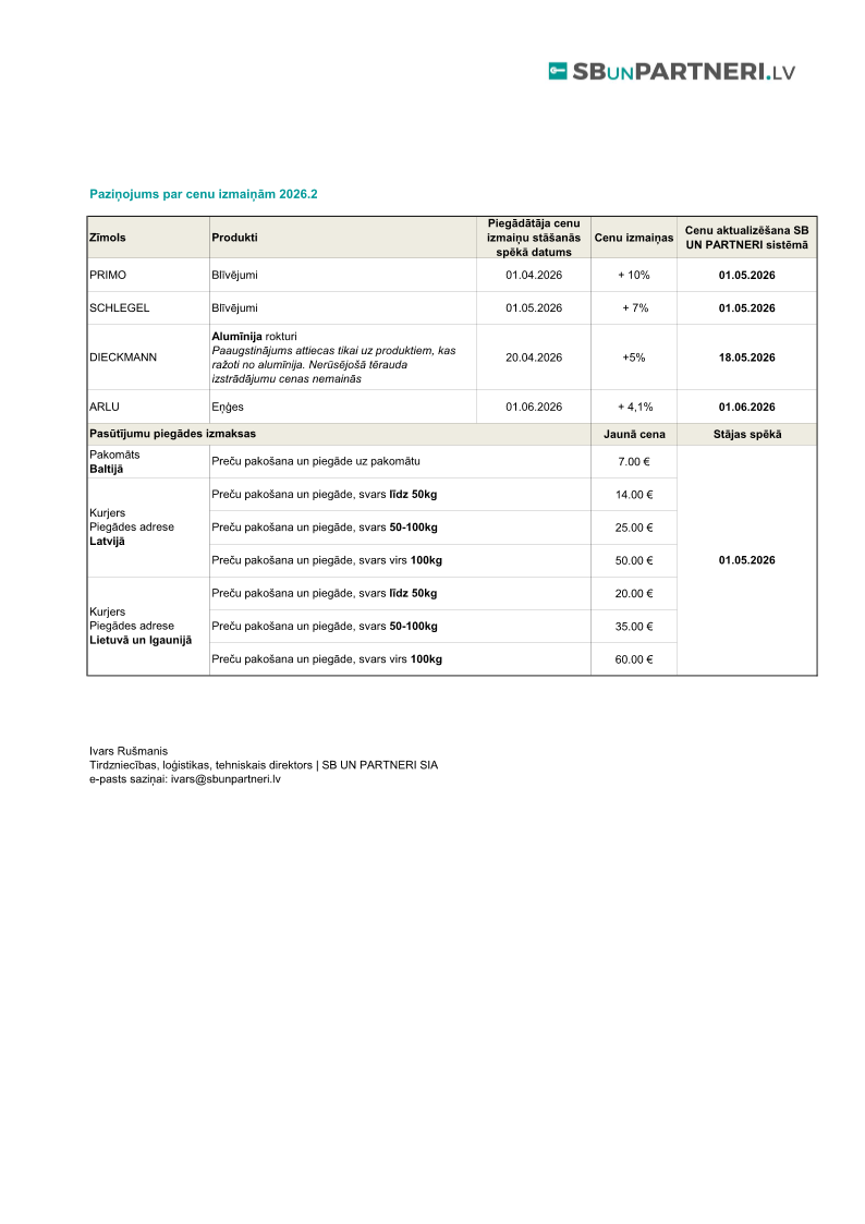 Paziņojums par cenu izmaiņām 2026. gada sākumā - papildināts 06.02.2026